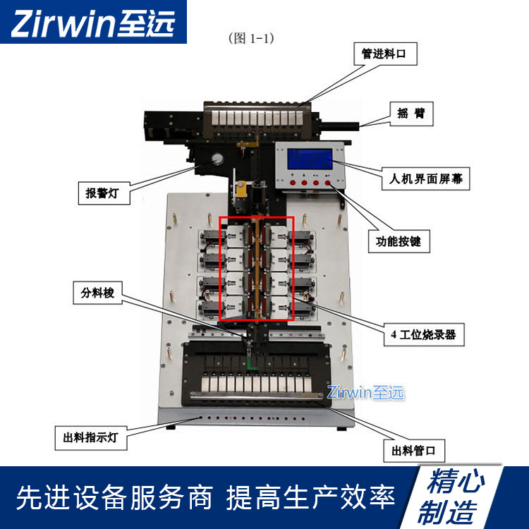 一次可上料12管,4個燒錄工位,出料13管(其中一管NG)